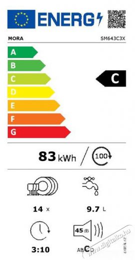 Ez az adott MORA SM 643C3 X a köv. energiaosztályba tartozik: C. Ezenkívül alacsony energiafogyasztás mellett magas mosogatási minőséget garantál. Az ECO program energiafogyasztása 83 kWh. Ciklusonként legfeljebb 14 terítéket mosogathatsz el vele. A mosogatógép sokkalta kevesebb vizet fogyaszt, mint amennyi elhasználódik a kézi mosogatás során. Az ECO program ciklusonkénti vízfogyasztása: 9,7 l. Eme MORA mosogatógép mérete: 84,5 × 59,9 × 59,7 cm (magasság × szélesség × mélység).