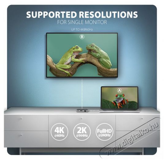 A HDMI kimenet kiváló minőségű képet biztosít akár 4K/60Hz Ultra HD felbontásig. A népszerű játékfelbontások 2K/144Hz vagy FullHD/240Hz magas frekvenciái szintén támogatottak. A HDR (high dynamic range) támogatásnak köszönhetően jelentősen kibővült szín- és kontrasztválasztékot élvezhet korlátozások nélkül. A DisplayPort Alternate Mode (DP Alt Mode) engedélyezett USB-C port vagy Thunderbolt 3/4 port szükséges a videokimenet megfelelő működéséhez.