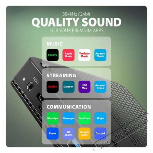 A 3,5 mm-es audiokimenetet sztereó fejhallgató, headset vagy aktív hangszóró csatlakoztatására használhatod. Az eszköz kiváló minőségű DAC konverterrel van felszerelve, amely akár 384 kHz/24 bites mintavételezést is támogat. Ennek köszönhetően csúcsminőségű hangzást élvezhetsz, amely ideális veszteségmentes formátumokhoz, mint például a FLAC, WMA, WAV, APE, AAC vagy az ALAC.