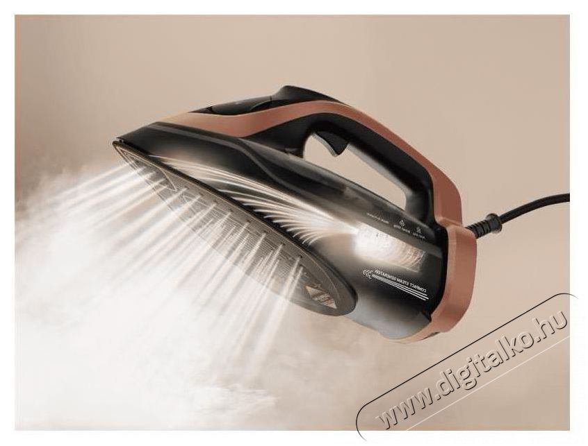 Vasaló - teljesítmény 3 200 W, függőleges gőzölés, folyamatos gőzteljesítmény 85 g/perc, gőzlöket 300 g/ perc, 5 program, automatikus gőz- és hőmérséklet-beállítás, vasalótalp Durilium AirGlide Autoclean a karcállóságért és a kivételes csúszásért, víztartály 350 ml, automatikus kikapcsolás, Anti scale rendszer, Anti-drip rendszer, integrált vízkő elleni védelem, LED vezérlőpanel, tápkábel hossza 2 m, precíziós csúcs, stabil vasalósarok, Franciaországban készült, szín fekete és réz, 15 év javíthatósági garancia.