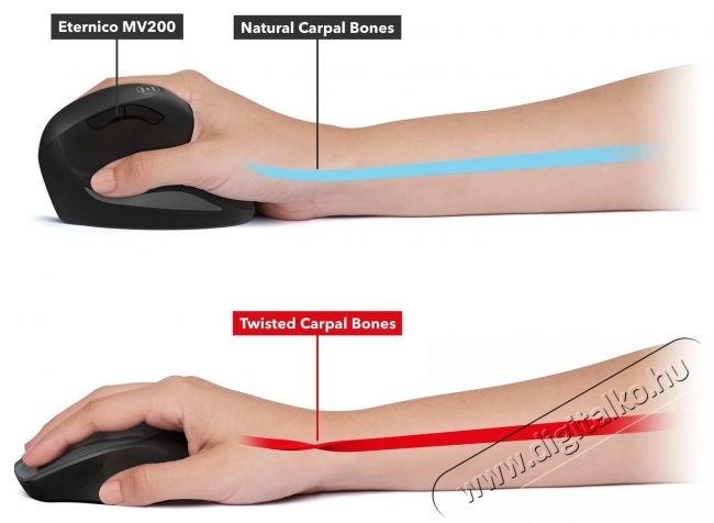 Ergonomikus függőleges egérA számítógépen végzett napi több órás munka idővel befolyásolhatja egészségedet. Ezért fontos, hogy ne becsüld alá a munkahely ergonómiáját, beleértve a tartozékokat is. Az Eternico Wireless 2.4 GHz Vertical Mouse MV200 egér szintén hozzájárulhat kényelmedhez és egészségedhez, és nemcsak a fájdalommentes munkát biztosítja, de megakadályozza például a carpalis alagút szindróma kialakulását is. Az egérkülönleges ergonomikus formájú, ami lehetővé teszi, hogy a csuklódat nyugalmi helyzetben tartsd, erőfeszítés és feszültség nélkül, hosszú távú munka során is.