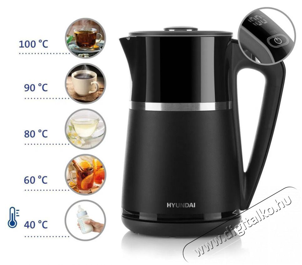 A rozsdamentes acél Hyundai VK309 vízforraló ideális készülék a különféle teák és kávék kedvelőinek. Az egyéni hőmérséklet-beállításnak köszönhetően az igényeid szerint készítheted el az italodat. A hőmérséklet-szabályozás 40 és 100 °C között lehetséges. Az áttekinthető LED kijelzőn jól látható a kiválasztott vízhőmérséklet. A 40 °C-os hőmérséklet például csecsemőtápszer készítésére alkalmas, a 60 °C pedig a zöld teához ideális, a fehér teákhoz 80 °C ajánlott, a kávéhoz 90 °C-os hőmérséklet megfelelő, instant levesek és italok, de a valódi fekete teához és a gyógyteákhoz forró vízre van szükség.