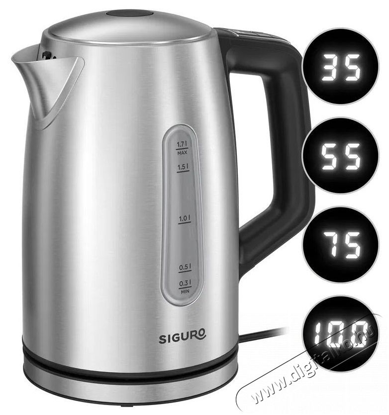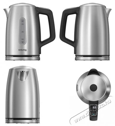 Ezen Siguro vízforraló rendelkezik kábeltartó rekesszel és forgó talppal is. A forgótalp lehetővé teszi, hogy a kannát bármilyen szögből ráhelyezd. A brit STRIX-csatlakozóval a vízforraló működtetése, valamint a vízforraló csatlakoztatása és leválasztása az alapról nagyon kényelmes. A továbbfejlesztett kiöntőnyílás segítségével a víz kiöntése könnyű és egyszerű. Előnye a hőszabályozás funkció. A vízszintjelzőnek köszönhetően mindig jól látható a vízforralóban lévő víz mennyisége. Praktikus kényelmi funkció a hangjelzés, amely jelzi a forralt víz elkészültét A tartályban lévő víz hőmérsékletét a beállított értéken tartja. A melegítés megkezdésekor LED világítás kapcsol be, amely mutatja, hogy a vízforraló üzem alatt van. A teljes kényelem érdekében használat közben LCD kijelző kínál átlátható információkat. A modern kijelzőnek köszönhetően folyamatosan követheted a víz hőmérsékletét is.