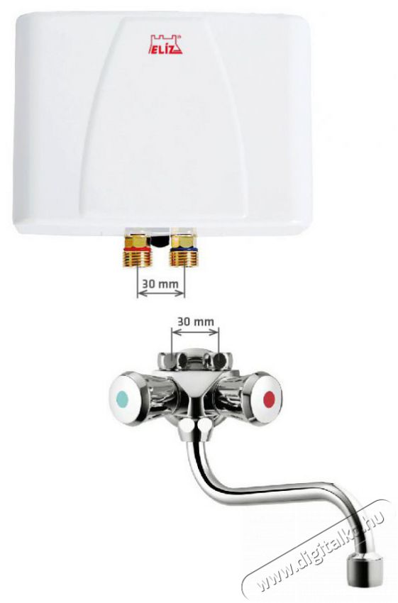 Az ELÍZ EHT 4.5 csatlakoztatható a mosdó vagy a konyhai mosogató alá vagy fölé. A mosogató feletti csatlakoztatás esetén a fűtőtest közvetlenül a mosogatócsapra szerelhető, a kivezetések 30 mm-es távolságával, a mosogató alatti csatlakoztatás esetén egy normál csaptelepre. A fűtőtest lehetővé teszi a kivezetések elforgatását is, mind függőlegesen, mind vízszintesen, 360°-os tartományban. Az ELIZ EHT 4.5 megbízható vízmelegítést biztosít.