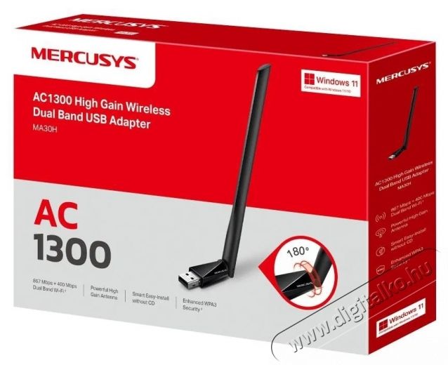 A Mercusys MA30H Wi-Fi USB adapter legfontosabb jellemzői- Sebesség akár 867 Mb/s (5 GHz) + 400 Mb/s (2,4 GHz)